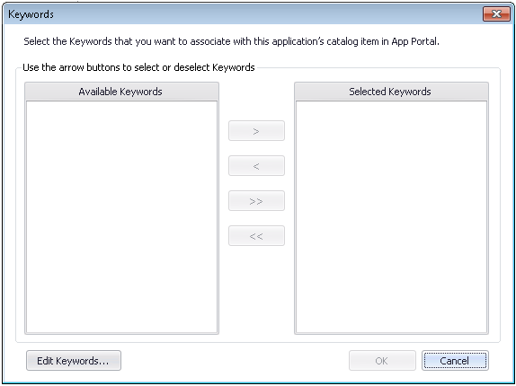 3. To add a keyword to an application, select the keyword in the Available Keywords list and then click the right arrow to move it to the Selected Keywords list.