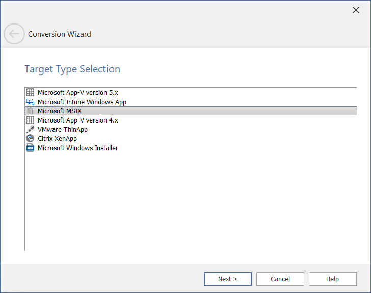 - In the Target Type Selection panel, select Microsoft MSIX, and then click Next.