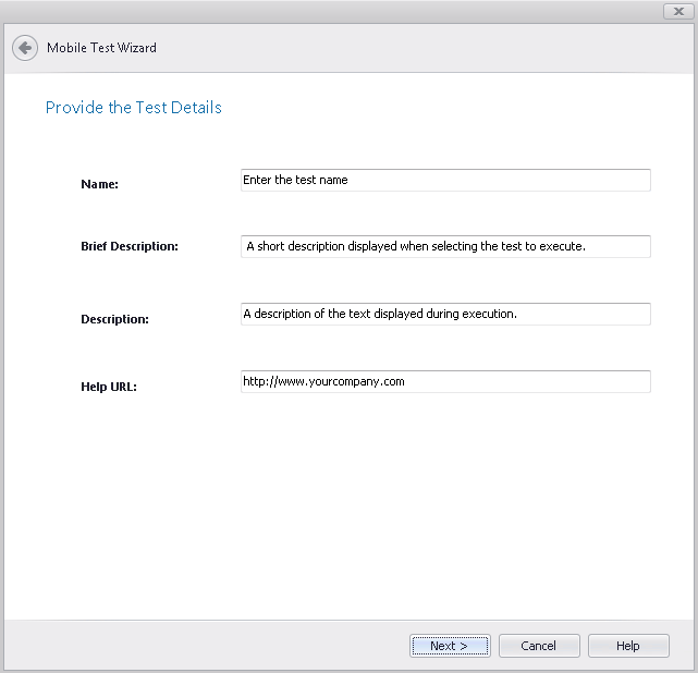 The information that was entered in the Brief Description, Description, and Help URL fields of the Provide the Test Details panel of the Mobile Test Wizard is displayed in the pane on the right of the Select Tests to Execute dialog box when the custom test is selected in the tree.