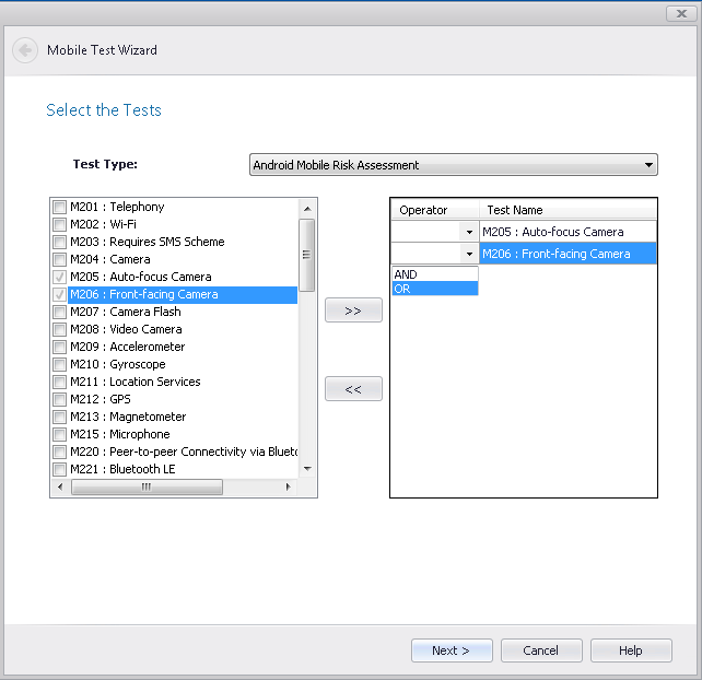 Use the arrow buttons to move the tests you want to include in the custom test to the list on the right. As you add the tests, join them using AND or OR operators by making selections from the Operator drop down list.