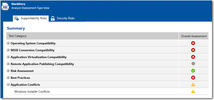 Test CategoryName of test category in the Application Conflicts test group for which errors or warnings were generated. When this test category is expanded, the tests in that category that generated errors or warnings are listed.