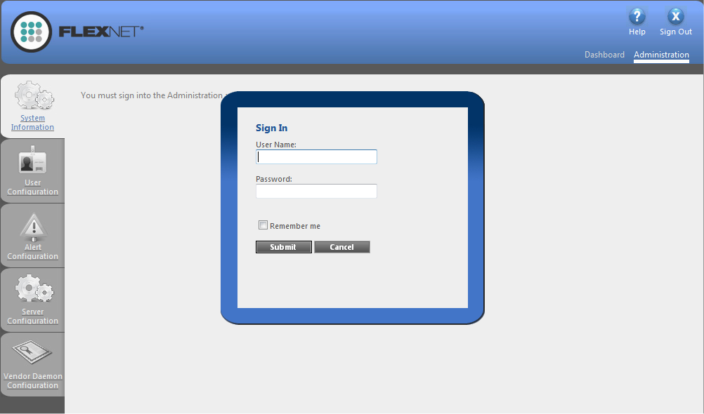 Password: admin tipIf the FlexNet Licensing Server is configured to run as a service, you can start the FlexNet Licensing Server service by using the Windows Services administrative tool. If the FlexNet Licensing Server is not configured to run as a service, you can start it by running lmadmin.exe. The FlexNet Licensing Server must be started in order to allow users to check out and check in licenses.